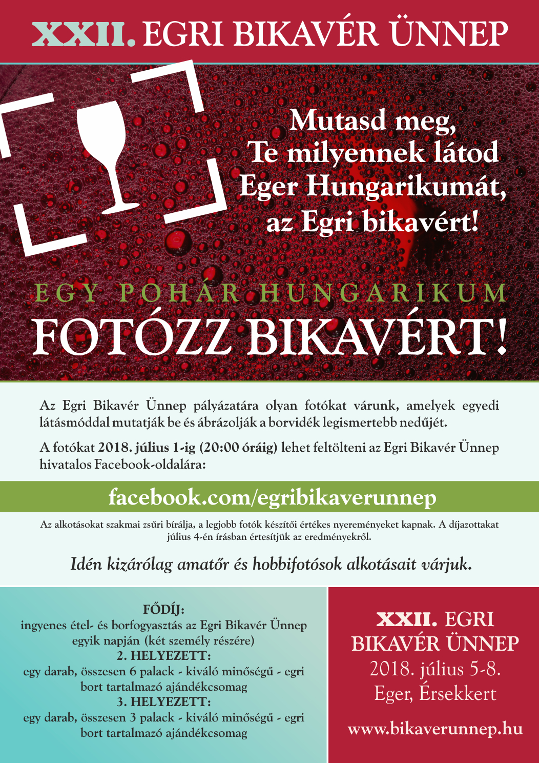 A fotókat július 1-ig (20.00 óráig) lehet feltölteni az Egri Bikavér Ünnep hivatalos Facebook-oldalára. Az alkotásokat szakmai zsűri bírálja, a legjobb fotók készítői értékes nyereményeket kapnak. A díjazottakat július 4-én írásban értesítjük az eredményekről.
